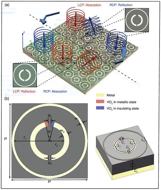 Recently, there have been advancements in chiral metasurfaces tailored for spin-selective reflection, enabling the reflection of a specific circularly polarized (CP) wave while absorbing the other one [,,,,,,,,]. For instance, Tang et al. provided both theoretical and experimental demonstrations of a chiral metasurface with -shaped metallic resonators on top of a dielectric spacer. This chiral metasurface achieved a maximum absorption of over 80% and a CD value of approximately 0.5 in the visible frequencies []. Qureshi et al. designed an ultra-thin chiral metasurface incorporating a mushroom-shaped resonator, which attained a peak absorption rate of 98.49% for incident LCP waves and only 7.39% for RCP waves at 12.4 THz, resulting in a remarkable CD value of 91.1% []. Nevertheless, once these chiral metasurfaces are fabricated their properties tend to be fixed, greatly limiting their functionality and efficiency. To address this challenge, the integration of tunable materials into chiral metasurfaces undeniably presents an optimal solution. Among these materials, vanadium dioxide (VO2), a phase change material, boasts advantages such as a phase change temperature close to room temperature and a notable contrast in performance before and after the phase transition []. A number of VO2-based tunable chiral metasurfaces operating in the THz and GHz bands have been proposed [,,,,,,]. Wang et al. introduced a chiral metasurface comprising a C-shaped metal open-end ring and an L-shaped VO2 configuration. This innovative design enables seamless switching of the CD response between the conduction and cut-off states while maintaining a CD value exceeding 0.9 within the frequency range of 5.70 to 8.55 THz []. However, despite their thermal regulation capabilities, these VO2 metasurfaces are limited to a single function of chirality-selective absorption, and lack compatibility with electronic devices.
