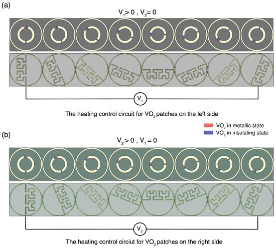 The proposed two-layer heating control circuit for selective control of the thermal states of VO2 patches at the meta-atom array level. This circuit is specifically tailored for the VO2 patches located on (a) the left side and (b) the right side of the SRR.