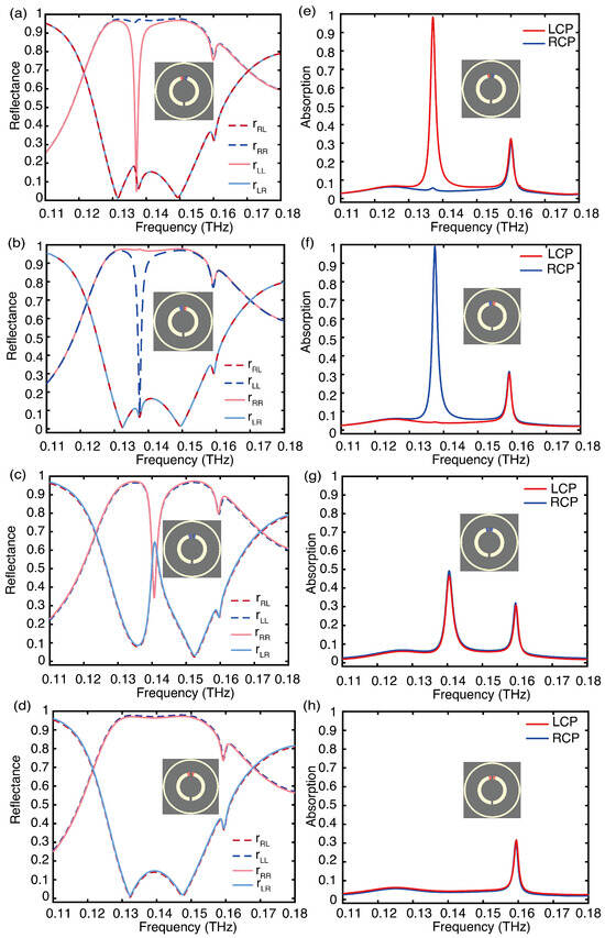 The simulated reflection and absorption spectra for the two VO2 patches in the insulated and metallic states are shown in Figure 3c,d, respectively. In both heating conditions, the structure is achiral, resulting in equal absorption of LCP and RCP. The simulated reflection differs only at the resonant frequency, where it is shifted to 0.14 THz due to structural changes. At non-resonant frequencies, the meta-atom exhibits cross-polarization reflection ( and ) below 20% and co-polarized reflection ( and ) above 90% within the frequency range of 0.13 THz to 0.15 THz. When the VO2 patches are in insulated states, the co-polarization reflection ( and ) coefficient mutate to 0.63 and the cross-polarization reflection ( and ) coefficient mutate to 0.36 at the resonant frequency. The absorption rates of RCP and LCP also mutate to 0.5, as shown in Figure 3g. This heating state can be considered a superposition of the heating states in Figure 3a,b. However, when the VO2 patches are in metallic states, there is no mutation, as depicted in Figure 3h. At non-resonant frequencies, both achiral structures reflect RCP and LCP within the frequency range of 0.13 THz to 0.15 THz.