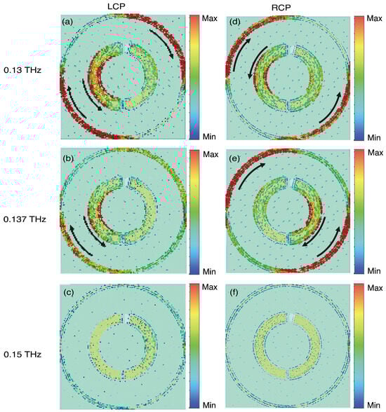 The surface current distributions of the meta-atom are induced when subjected to normally incident LCP waves at frequencies of (a) 0.13 THz, (b) 0.137 THz, and (c) 0.15 THz as well as to RCP waves at frequencies of (d) 0.13 THz, (e) 0.137 THz, and (f) 0.15 THz.