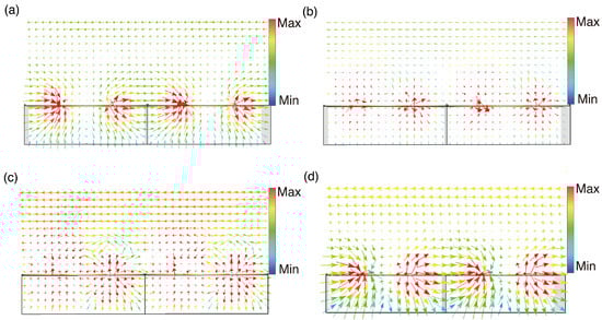 In order to further study the chiral effect of the MIM structure, the electric field distribution of chiral atoms in Figure 3a,b was studied under the normal incidence of CP waves. Figure 5 illustrates the electric field distribution of the two chiral meta-atoms at the resonant frequency 0.137 THz. Figure 5a,b depicts the chiral meta-atoms in the heated state, as shown in Figure 3a, wherein the MIM structure produces a macroscopic vertical electric field under normal incidence of LCP. This electric field subsequently creates a magnetic vortex at the interface between the VO2 and Al layers, thereby achieving the spatial localization effect for the LCP. However, this effect is not observed under normal incidence of RCP waves. This difference leads to the emergence of chirality. The other opposite heating state in Figure 5c,d produces a similar electric field distribution when subjected to the incidence of opposing chiral CP waves.