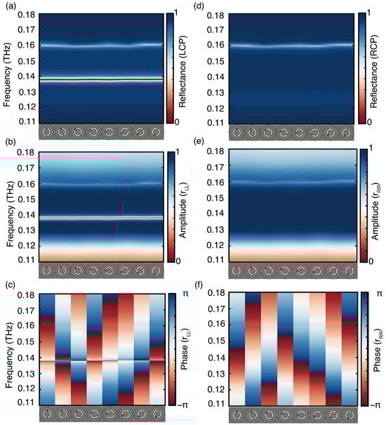 The additional phase shift introduced by the geometric phase metasurface is solely determined by the rotation angle of the meta-atom, which follows a general relationship of twice the rotation angle []. This phase manipulation method exhibits wide bandwidth characteristics. To illustrate the metasurface’s abilities in spin-selective absorption and chirality-preserving anomalous reflection, eight meta-atoms were chosen for simulation verification, each with a rotation angle ranging from 0° to 157.5° in increments of 22.5°. The corresponding electromagnetic responses of LCP and RCP incident waves are shown in Figure 6. Figure 6a,d depicts the variations in reflection spectrum corresponding to LCP and RCP incident waves, respectively, across the eight meta-atoms. Figure 6b,e indicates that the co-polarized reflection amplitudes of these eight meta-atoms remains relatively consistent within the frequency range of 0.13 THz–0.15 THz, with a notably high reflection efficiency (>0.9) at the non-resonant frequency. The corresponding co-polarization reflection phases are shown in Figure 6c,f. At non-resonant frequencies, both the reflected LCP and RCP waves undergo a linear phase change that is twice the rotation angle. This phase change is devoid of dispersion, covering nearly 2 for both LCP and RCP waves. Notably, Figure 6c displays an abrupt resonate change at 0.137 THz, corresponding to Figure 3e. This phenomenon primarily occurs because the chiral meta-atoms efficiently absorb the LCP wave at the resonant frequency while simultaneously reflecting the RCP wave.