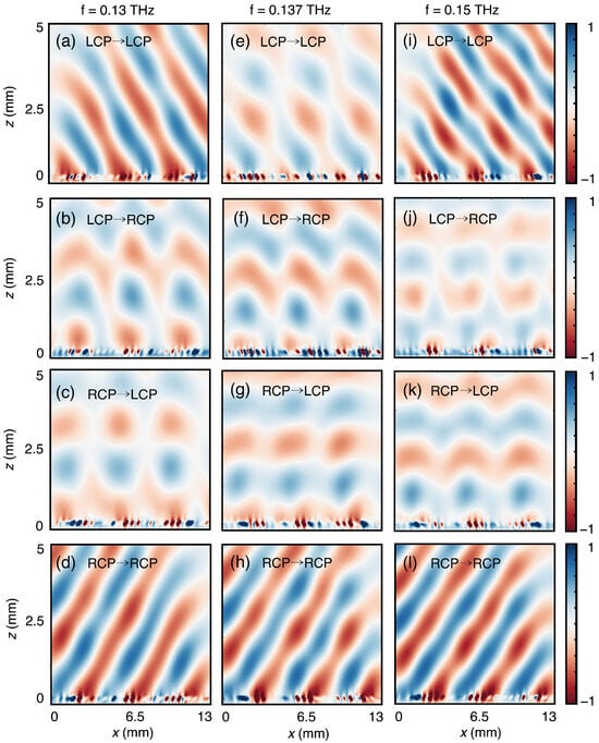 The scattered electric field distributions of the gradient chiral metasurface under normal incidence of different CP waves. The figures on the left (a–d), middle (e–h), and right (i–l) correspond to 0.13 THz, 0.137 THz, and 0.15 THz, respectively.
