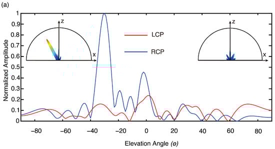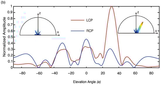 A full wave simulation was performed in order to investigate the scattering performance of the gradient chiral metasurface. Figure 7 illustrates the scattered electric field distributions for CP waves under normal incidences. The CP waves are efficiently deflected at non-resonant frequencies within 0.13 THz–0.15 THz, and polarization conversion is effectively suppressed. At the chiral resonant frequency of 0.137 THz, LCP incident waves are significantly absorbed, and only RCP waves are deflected from the metasurface. The numerical far-field radiation pattern of the metasurface at the resonant frequency 0.137 THz when the metasurface exhibits a chiral structure is shown in Figure 8. The one-dimensional normalized far-field scattering patterns of the metasurface with the left VO2 patches in the metallic states, corresponding to the heating state in Figure 3a, are shown in Figure 8a. The inset figures show the three-dimensional (3D) far-field scattering patterns under normal incidences of CP waves. At the chiral resonant frequency of 0.137 THz, LCP waves are significantly absorbed, and only RCP waves are deflected from the metasurface. The one-dimensional far-field normalization results and 3D far-field scattering patterns corresponding to the other opposite heating state in Figure 3b are shown in Figure 8b. While the electromagnetic response is similar, the handedness of the absorbed and reflected waves is reversed. These results show the spin-selective anomalous reflection, polarization selection, and chirality-switching functions of the designed metasurface. By manipulating VO2, the metasurface regulates both chiral resonance and polarization channels, effectively controlling the amplitude, phase, and polarization state of CP waves.