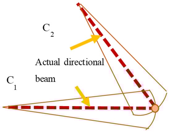 In simpler terms, this means that if the sonar image data acquired from one measurement point are converted into 3D spatial data and then multiplied with 3D spatial data derived from sonar image data obtained from another measurement point, and both results demonstrate a high reflection intensity, they will form spatial data with peak regions. This facilitates the accurate spatial localization of underwater bridge piers. By adopting this method, the actual direction of the beam pulse can be ascertained using data obtained from two sonar images, as depicted in Figure 5.