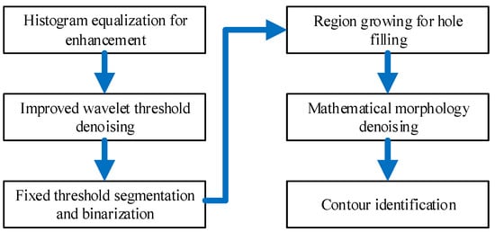 The recognition of underwater bridge piers’ surface profiles plays a pivotal role in the field of 3D digital reconstruction, as it directly influences key factors such as efficiency, complexity, and precision in the 3D digital reconstruction process. In this section, we introduce an automated recognition method designed to extract underwater bridge pier surface profiles from 2D sonar images. The workflow for this method is visually depicted in Figure 6, and it encompasses the following primary steps: