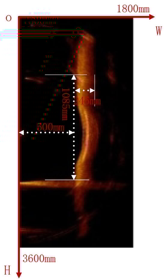 In this section, we illustrate the automated recognition process of the 2D sonar image for the surface profile of underwater bridge piers using an example of original pseudocolor sonar images of underwater bridge piers. The dimensions of the original pseudocolor sonar image of underwater bridge piers are 450 pixels by 900 pixels, with the sonar positioned 500 mm away from the center of the pier, and the underwater portion of the pier measuring 1085 mm in length and 245 mm in diameter, as depicted in Figure 7.