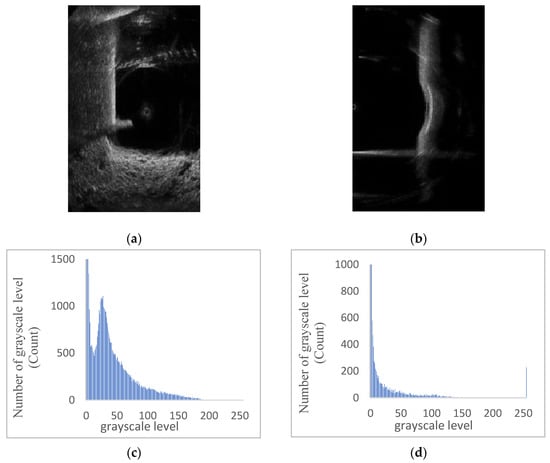 Histogram statistical examples of partial bridge pier sonar grayscale images. (a) Grayscale sonar image of actual bridge pier. (b) Grayscale sonar image of bridge pier experimental model. (c) Actual bridge pier sonar grayscale image histogram. (d) Bridge pier experimental model sonar grayscale image histogram.