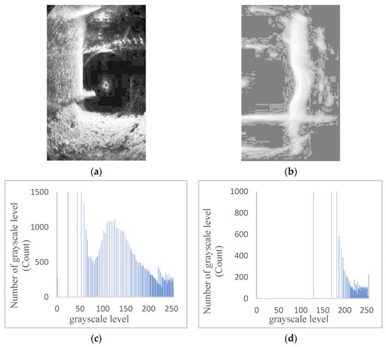 Results after histogram equalization. (a) Processed grayscale image of actual bridge pier. (b) Processed grayscale image of bridge pier experimental model. (c) Processed histogram of actual bridge pier. (d) Processed histogram of bridge pier experimental model.