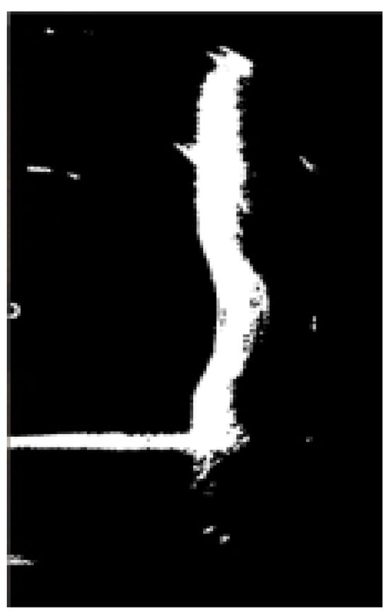 Following the previous histogram equalization process, the histogram exhibits a bimodal distribution, representing two distinct object classes with significant grayscale differences. This corresponds to an image consisting of a darker background and brighter targets, as depicted in Figure 9d. By carefully selecting an appropriate threshold value “T” at the trough point between the two histogram peaks, it becomes possible to effectively separate the bridge pier from the background. Consequently, for image segmentation in this section, we have opted for the fixed threshold method, configuring “T” to 220. Simultaneously, the image undergoes binarization, where pixels less than or equal to the threshold are assigned a grayscale value of zero, while pixels exceeding the threshold are assigned a grayscale value of 255. Figure 11 illustrates the results of applying the fixed threshold segmentation to Figure 10.