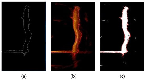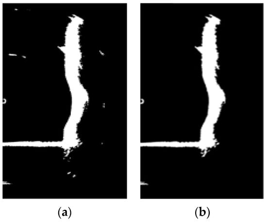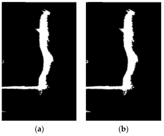 Specifically, for the removal of dark regions in the underwater bridge piers’ sonar image, the entire image is scanned. White pixels are considered valid, and a 4-neighbor detection is utilized to calculate the number of pixels in each region. If the total count falls below a predetermined threshold, the region is cleared, effectively filling the dark regions, as illustrated in Figure 12a. When eliminating white regions, a subsequent scan of the entire image is conducted, with black background pixels being deemed valid. An 8-neighbor detection scheme is employed to compute the pixel count in each region. If the total count falls below a predefined threshold, the region is cleared, resulting in the filling of white regions, as shown in Figure 12b.