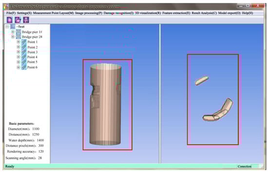 (3) We have developed 3D visualization software for underwater bridge piers based on sonar images, utilizing the Visualization Toolkit (VTK). This software adopts surface rendering techniques and leverages VTK’s visualization capabilities to display 3D models of underwater bridge piers. Furthermore, it offers interactive functionalities such as translation, scaling, and rotation, enhancing the convenience of researchers in analyzing and observing surface defects within underwater bridge pier 3D models.