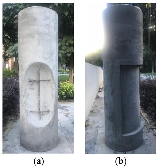 A comparison of the calculated volume of the model’s defects with the volume obtained from actual direct measurements is shown in Table 4. The relative error for the hole volume is 13.56%, and for the spalling volume, it is 10.65%. The reconstructed model accurately reproduces the volume of the bridge pier’s defects. In practical engineering applications, when the defect size is small, it has a relatively minor impact on the pier’s load-bearing capacity and safety. When the defect size is large, despite the higher relative error, it still remains within acceptable limits. This is because, based on the load capacity experimental calculations, it is below the 15% safety assessment requirement []. This method has been successfully applied to actual engineering projects, including the Fuzhou Wulongjiang Bridge and the Fuqing Xizixiang Bridge sonar inspections, where the actual measurement results are consistent with the laboratory model test results.