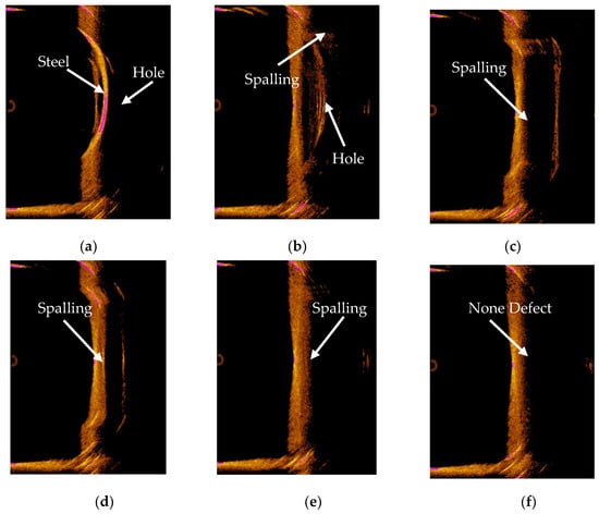 (2) Sonar images at 52°, 104°, 156°, and 208° correspond to areas with spalling surface defects.