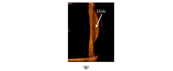 When the bridge pier model at a measurement point did not exhibit any defects, the inner and outer contours of the bridge target in the sonar image appeared as straight lines, as seen in Figure 27f. This indicates that the bridge pier in that area has no surface defects.
