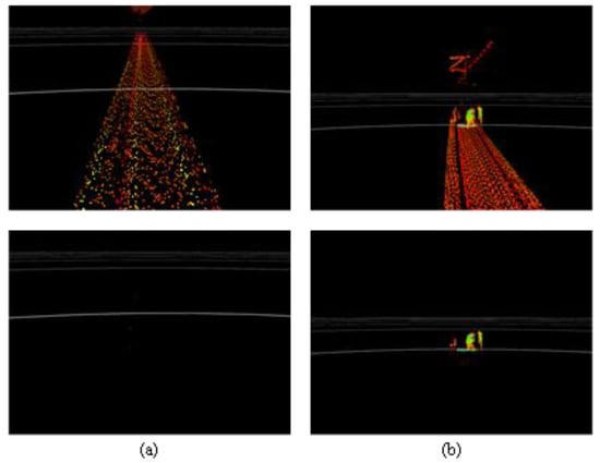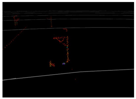 By estimating the ground height and cropping point clouds over a certain vertical range, objects such as rails, overhead lines, and tunnel ceilings were removed as part of the 3D track area extraction. One common approach for estimating the ground height is to partition the point cloud using squares or sectors and then locate the ground in each partition with plane fitting. These methods typically combine uprightness, elevation, flatness, and other conditions to determine whether the fitted plane represents the physical ground. In this paper, we adopt and modify the patchwork algorithm proposed by Li []. The patchwork technique identifies ground sections in each partition individually. If a ground region is not found in certain partitions, irrelevant points may not be rejected in the 3D track area, which may cause false alarms. As such, we used points extracted from each partition to refit the ground region. These points were then merged using the normal direction. Under the constraint of longitudinal rail line specifications, this slope does not change frequently, and, at most, one slope change was assumed in the detection range. Thus, if no slope change occurred over this distance, all the ground points were merged into a single unit. If a slope change did occur, the ground points were merged into near and far sections. After estimating the ground location, the rail height and train height were used to define a region 0.3–3.2 m above the refitted ground plane. This space was then cropped to extract the 3D rail area. Figure 11 shows the effects of 3D extraction for the 2D rail area shown in Figure 10. It is evident that the ground, overhead lines, and tunnel ceilings were removed, as the resulting 3D track area contains only obstacles and sporadic noise points.