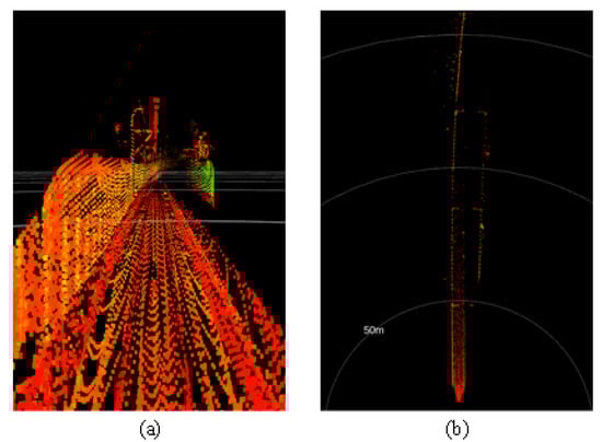 A point cloud collected by the Livox Tele-15 LiDAR system in an elevated section. (a) The raw point cloud. (b) The point cloud projected onto a horizontal plane.