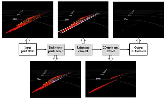 Figure 3 demonstrates the main process used for track area extraction proposed in this paper. First, the points formed by the references are selected in segments along the front of the train. Next, the reference points are projected onto the horizontal plane and curves are fitted on both sides. Then, after selecting a better curve from the two curves on both sides, the horizontal range of the track area is determined from the positional relationship shown in Figure 4. The point cloud within this horizontal range defines the 2D track area. Finally, the ground is fitted and points with a height that is either too high or too low are removed to obtain the 3D track area.