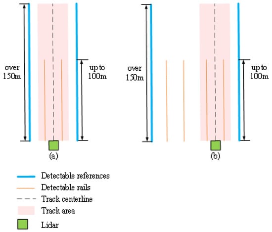 Position relationships for detectable references and rails, the track centerline, and the track area in the horizontal plane for (a) single-line and (b) double-line sections.