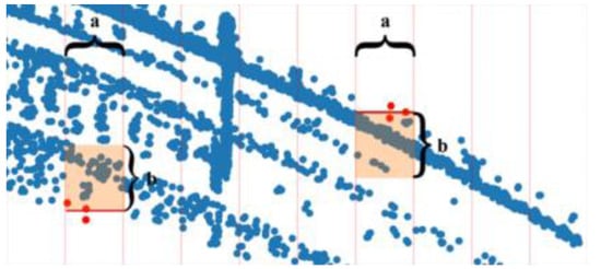 A novel technique is proposed in this study for selecting reference points based on fixed-length segmentation. This approach facilitates a more complete selection of reference points, while reducing interference from irrelevant structures such as overhead line pillars, trees, and buildings. As shown in Figure 7, point clouds were segmented using a fixed length along the X-axis and reference points were identified in each section. The detailed steps can be described as follows: