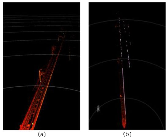 Figure 1 shows a typical LiDAR point cloud at ~150 m, where objects with good reflectivity and optimal reflection angles are clearly visible. However, it is difficult to determine whether these obstacles are inside the track area. In fact, the appearance of objects such as trackside markers and transponders are similar to that of intrusions in the point cloud. Thus, if the track area cannot be determined to exclude these items through positional relationships, it may cause false alarms. In other words, the distance over which the track area can be extracted determines the effective detection range for obstacles. In urban rail transit lines, structures parallel to the rails (e.g., tunnel walls, protective walls, and sound barriers) provide feasible references for increasing the extraction distance of track regions.