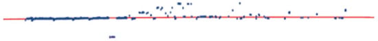 The reference points selected using the approach described in Section 2.1 were projected into the horizontal plane, thereby transforming a surface fitting problem into a curve fitting problem. Based on the shape specifications of urban rail transit lines, the coefficient of the polynomial curves was set to 2. While the least squares method is perhaps the most commonly used curve fitting algorithm, it is highly sensitive to noise []. Clustering was also applied during curve fitting to remove noise. However, with this approach, it can be difficult to completely retain the reference information while removing as much noise as possible. Random sample consensus (RANSAC) has been shown to identify optimal explanatory models in noisy datasets. Unlike the least squares method, RANSAC does not directly utilize all points during curve fitting. Instead, it randomly selects three points and calculates the residual of each. The curve points with residual values lying within a certain threshold are considered to be inliers. Over the course of multiple iterations, RANSAC identifies a curve containing the most inliers that best explains the point set. In this study, the residual threshold was set to 0.2 m and 100 iterations were performed on the reference points. The fitted curve is shown in Figure 9, where it is evident that RANSAC provides strong anti-noise capabilities.