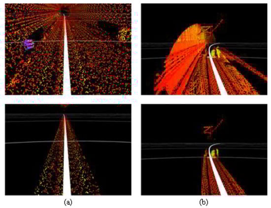 As seen in the figures, the obstacles, trackside markers, and transponders formed an obvious cluster in the cloud, containing points with a higher reflection intensity. The performance of the proposed technique was evaluated by determining whether the position relationship between the extracted track area and the objects was consistent with their physical orientations. Figure 14 shows the effect of extracting track areas using the proposed technique, where the rows represent the raw point clouds, reference curves, 2D track areas, and 3D track areas, respectively. Similarly, the columns denote the outdoor straight, outdoor curved, multi-line, and tunnel sections, respectively. The extracted 3D track regions in (a) and (d) correctly retained the obstacle points, while (b) and (c) contained only sporadic noise points. Table 4 shows the results of track area extraction within 150 m, where it is apparent that the proposed method provides high accuracy in various experimental scenes. In Table 4, the accuracy for the tunnel sections was higher than that of the elevated sections, since tunnel walls constitute more points than sound barriers and protective walls. As a result, there is no interference from points outside the tunnels. By analyzing incorrect results from the outdoor scenes (i.e., elevated and ground sections), we found that recessed drains inside the track interfered with ground estimation, as shown in Figure 14. On occasion, this led to the erroneous removal of obstacles and the retention of transponders and rail segments in the extracted 3D track areas.