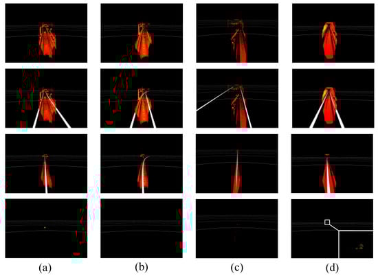 The effects of track area extraction in different sections. The extracted 3D track regions in (a) and (d) correctly retained the obstacle points, while (b) and (c) contained only sporadic noise points.
