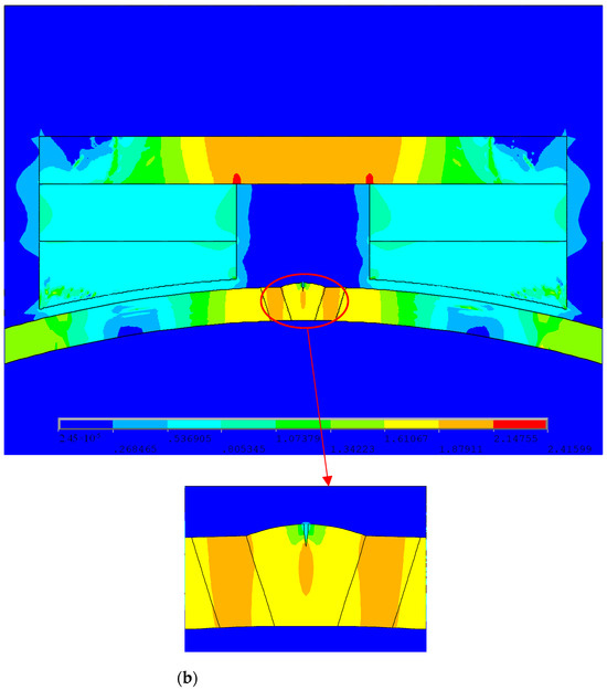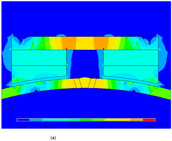 The magnetic circuit design requires that the magnetic field intensity of the magnetic circuit should make the pipeline reach saturation or a near-saturation magnetization state, and the volume of the magnetic circuit structure should be as small as possible. The specific requirement for the magnetization intensity is greater than 80% of the saturation magnetization intensity. Pipelines are usually made of low-carbon steel material with a saturation magnetic induction intensity of 1.6 T, so the magnetization intensity detected must reach 1.2 T or above. Figure 2a–c show the magnetic induction intensity cloud maps of the X80 pipeline weld without defects, cracks on the X80 pipeline weld, and cracks in the fusion zone of the X80 pipeline weld, respectively. The magnetic flux leakage detector for the ferromagnetic pipeline welds designed in this paper meets the requirement that the magnetic induction intensity at the position of the pipeline weld be greater than 1.2 T.