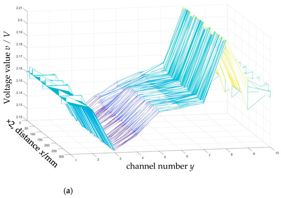 Figure 9 illustrates that the magnetic flux leakage signal of the pipeline weld shows a downward and then upward trend, that is, the trough appears first and then the peak, showing a “trough-peak” trend. The magnetic flux leakage signal of the crack in the middle of the pipe weld shows a trend of first going up and then going down, that is, the peak appears first and then the trough appears. The superposition of the pipe weld signal and the crack signal shows a “trough-peak-trough-peak” trend. The edge cracks of the pipe weld show a trend of going up first and then going down, that is, the peak appears first and then the trough appears. Due to the location of the defect, the edge crack trough and the weld trough overlap, showing a “peak-trough-peak” trend. Through comparison with the numerical simulation analysis [26] related to this research group, it is consistent with the numerical simulation trend shown in the literature [26] when the weld has no defects and cracks exist at different positions of the weld. And as the depth size of the pipeline weld defect increases, the magnetic flux leakage signal shows an increasing trend, which is consistent with the numerical simulation trend of the weld crack expansion process shown in the literature [26].