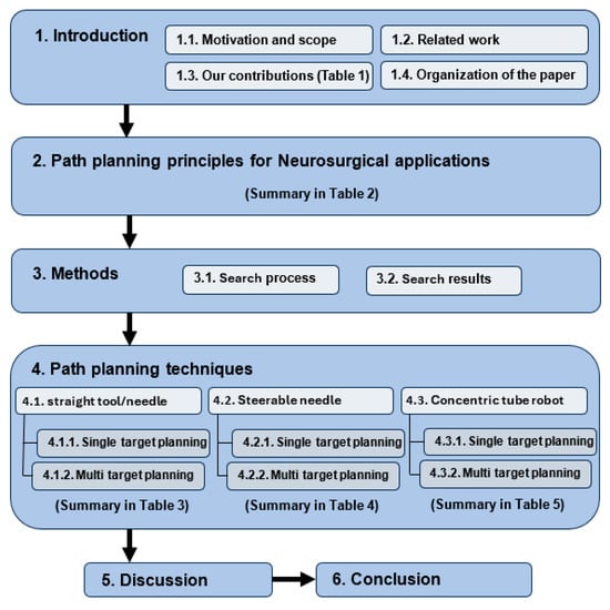 Through this systematic search review paper, we aim to review the literature on relevant algorithms for automatic or semi-automatic path planning for neurosurgical interventions based on the intervention tool type, application type, and the scope of the validation study (i.e., simulation, phantom, preclinical, and clinical studies). We will also summarize and report the most recent advancements in the field and future trends in path planning for neurosurgical applications. In the following sections, we will outline the organization of the paper.