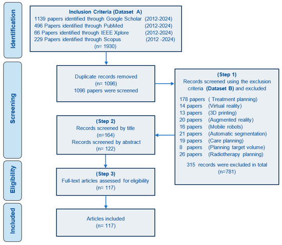 Figure 4 shows the data extraction results at every screening step. 1096 study titles were obtained from initial database search using keywords listed in Dataset A after removing the duplicated papers. We excluded 315 that met at least one of our exclusion criteria listed in Database B, leaving 781 studies to be assessed by screening the title and the abstracts. This screening step resulted in 122 papers and after the eligibility check, we included 117 papers in this review paper.