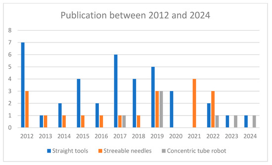 Figure 5 illustrates the number of publications that investigated automatic path-planning algorithms for three categories: (1) straight tools, (2) steerable needles, and (3) concentric tube robots, from January 2012 to July 2024. In the following sections, we have discussed these papers in detail.