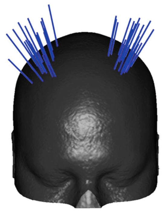 Other considerations include the fact that the entry point should be posterior to the hairline for cosmetic reasons and preferably not through the motor cortex to avoid side effects []. The intracerebral length of the path should be minimized [,]. The drilling angle to the skull and sometimes the orientation of the electrode should be optimized depending on the target shape [,].