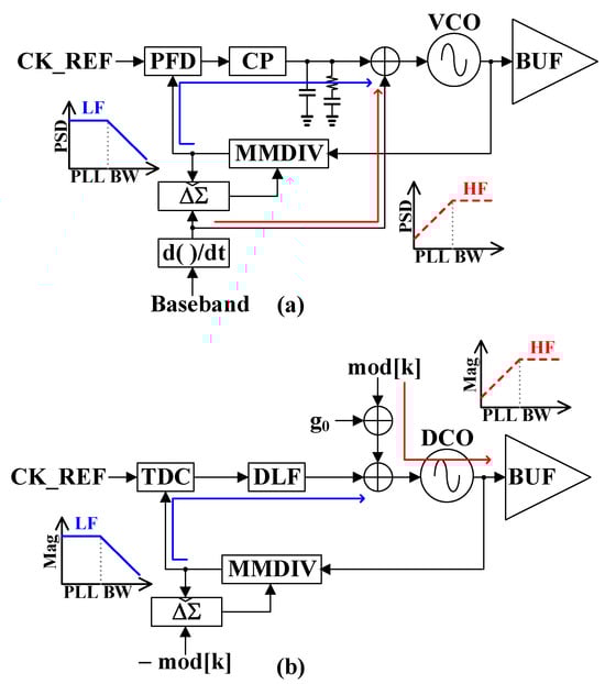 In most state-of-the-art systems, the GFSK is implemented by modulating the PLL’s output frequency during closed-loop operation, which means that the PLL’s bandwidth is a limiting factor concerning the maximum data rate that may be applied. Two-point modulation (TPM) has been investigated as a method to enable data rates exceeding the bandwidth of the conventional charge pump phase-locked loop (CPPLL), as shown in Figure 1a []. The low-frequency components of the baseband transmit signal are frequency-modulated within the PLL bandwidth through a fractional-N frequency synthesizer, while the high-frequency components are frequency-modulated outside the PLL bandwidth by applying the baseband transmit signal directly to the second tuning input of the voltage-controlled oscillator (VCO). This scheme can resolve the problem of the modulation bandwidth being limited to the PLL bandwidth. Therefore, it can not only maintain high data rate modulation within a closed loop, but can also exclude the use of mixers and RF band-pass filters. However, in deep sub-micron CMOS technology, the CPPLL encounters limited voltage headroom, current mismatch, filter capacitor leakage, and reduced dynamic range in nano-scale CMOS processes.