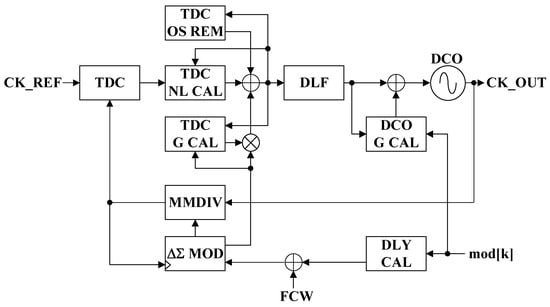 The proposed ADPLL architecture is shown in Figure 2. A MASH111 ΔΣ modulator is employed to reduce fractional spurs due to the nonlinearity of a multi-modulus divider (MMDIV) and a TDC. The delay from the DCO clock edge to the feedback clock edge is dependent on the division ratio. The dynamic changes in the MMDIV ratio for the fractional-N ADPLLs result in the increased in-band phase noise floor due to noise folding. This issue is mitigated by using two-stage retiming flip-flops to resynchronize the feedback clock with the DCO clock. The expected phase error is generated from the ΔΣ modulator quantization error. After scaling by the estimated TDC gain calibration (TDC G CAL), the resulting value is subtracted from the TDC output before entering the digital loop filter (DLF).