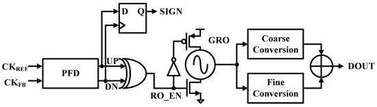 While conventional gated ring oscillator (GRO) TDCs can cover a wide input range, achieving high resolution is difficult and can be highly dependent on PVT variations. Figure 3 shows a phase frequency detector (PFD)-based gated ring oscillator (GRO) TDC. Up and down signals of the PFD, as described in Section 4.1.1., are connected to an XOR gate and a flip-flop to capture positive and negative phase errors, which have not been captured with conventional TDCs []. As described in Section 4.1.2 and Section 4.1.3, the proposed GRO TDC uses a PVT adaptive LDO to make it insensitive to PVT variations. Coarse and fine transforms are used to improve the TDC resolution, as described in Section 4.1.4.