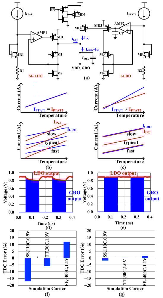 The reference voltages of both LDOs (M-LDO and I-LDO) are generated by current sources proportional to the absolute temperature (PTAT), IPTAT, that require a large saturation voltage to achieve high resistance, which reduces the voltage headroom of the reference circuit. In the proposed LDO, instead of the inverter replica bias circuit consisting of NMOS and PMOS with diodes connected in series, only a diode-connected NMOS bias circuit is used for low-voltage operation, which can compensate for the NMOS process variation of the GRO. The compensation for PMOS process variation is conducted at the feedback path where there is no voltage headroom issue. Even if the proposed LDO uses PTAT current sources, it is difficult to maintain a constant supply voltage of the GRO due to the difference between the current change in the proposed LDO and the current used for the GRO from temperature variation. Figure 6b shows the relationship between the injected current, IINJ, the current used by the GRO, IGRO, and the output voltage as a function of temperature in the non-optimized case with IPTAT1 = IPTAT2. At low temperatures, the IINJ is less than the current used by the GRO, IGRO, and at high temperatures, the injected current is more than the current used by the GRO. Therefore, a temperature-dependent mismatch occurs, resulting in the RO supply voltage changing during operation, which causes the TDC linearity to deteriorate. On the other hand, if optimized with different slopes of IPTAT_AUX and IPTAT_MAIN, as shown in Figure 6e, the current is tracked against temperature variation to keep the RO supply voltage constant during operation and prevent TDC linearity deterioration. Figure 6b shows the relationship between the injected current, IINJ, the current used by the GRO, IGRO, and the output voltage as a function of temperature in the non-optimized case with IPTAT1 = IPTAT2. At low temperatures, the IINJ is less than the IGRO, and at high temperatures, the IINJ is more than the IGRO. Therefore, a temperature-dependent mismatch occurs, resulting in the GRO supply voltage changing during operation, which causes the TDC linearity to deteriorate. To overcome this, resistors R1 and R2 are connected in series with two reference circuits and use different resistor values to optimize the slope of I-LDO’s change with the temperature change to be smaller than M-LDO so that the power supply voltage of the GRO can be kept constant during operation and to prevent TDC linearity deterioration through the LDO adapting to temperature variation. Figure 6c shows the relationship between the IINJ, the IGRO, and the output voltage as a function of temperature in the optimized case with IPTAT1 ≠ IPTAT2, which enables the IINJ to track against temperature variation to keep the GRO supply voltage constant during operation and prevent TDC linearity deterioration.