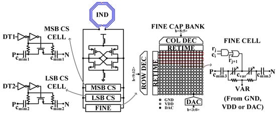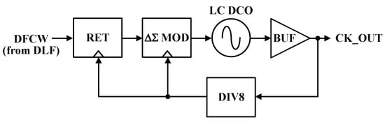 The LC DCO is preferred for high-frequency WSNs since it provides low phase noise and high frequency stability despite the large size and high cost compared to the ring DCO. Figure 8 shows the LC DCO with the ΔΣ modulator (ΔΣ MOD) and retiming. Frequency dithering is applied to reduce DCO quantization noise with a divide-by-8 DCO (DIV8) clock. The DLF’s input digital frequency control word (DFCW) is synchronized to the ΔΣ MOD using the DIV8 clock in the re-timer (RET). The second-order ΔΣ MOD shapes the DCO quantization noise to a high offset frequency to meet LO phase noise requirements for the WSN applications. Moreover, the dithering technique enhances the frequency resolution of the DCO. Furthermore, 8-bit fine-tuning cells are arranged in a 16 × 16 array, and one varactor fine-tuning cell is variable with 4-bit DAC control.