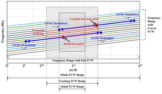 The ADPLL uses a negative feedback mechanism to find the locked state. Figure 10 shows the behavior of GFSK modulation with frequency control words (FCWs) over the coarse- and fine-tuning capacitor bank frequency range. The fine-tuning capacitor bank can cover more than 2 MHz. For the initial lock operation, the frequency control words (FCWs) of the fine-tuning capacitor bank are limited to within ±250 kHz centered at 211 FCWs. After the initial lock, the GFSK modulation of ±500 kHz centered on the initial lock point is performed for a 2 Mb/s data rate. For BLE operation, the ADPLL continuously tracks new lock points to adapt to environmental changes. For the tracked new lock point, the FCW of the fine-tuned capacitor bank is limited to within ±500 kHz centered on 211 FCWs, and the GFSK modulation of ±500 kHz centered on the tracked new lock point is performed.