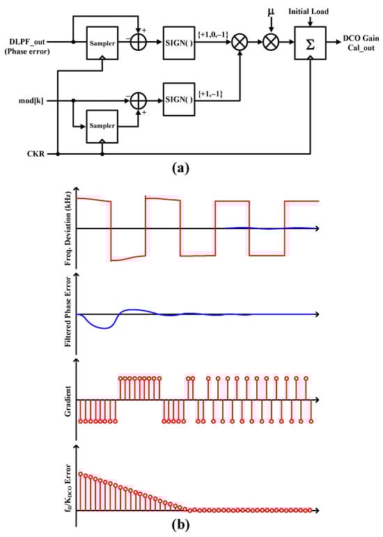(a) LMS adaptation algorithm for calibrating the DCO gain and (b) DCO gain adaptation process example.