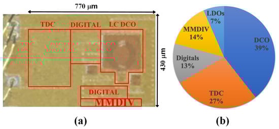 Figure 12a shows a micrograph of the proposed GFSK modulator implemented in a 1P8M 28 nm CMOS process. It includes the ADPLL with a TDC, an LC DCO, an MMDIV, digital blocks for a DLF, and digital controllers. The TPM is applied to the ADPLL to achieve 2 Mb/s GFSK with 32 MHz CK_REF. The core area is 0.331 mm2. A 1.0 V power supply is used, and the total power consumption is 1.6 mW. Figure 12b shows power breakdown. The DCO, TDC, MMDIV, digitals, and LDOs consume 633 μW, 436 μW, 227 μW, 204 μW, and 106 μW, respectively. The GFSK modulator design demonstrates a careful balance between power consumption, linearity, and frequency range for BLE applications. The modulator achieves an excellent linearity of 1.42% FSK error while consuming only 1.6 mW, covering a wide frequency range of 2.21–2.58 GHz. There are trade-offs to consider. Improving linearity further would likely increase power consumption. Reducing the frequency range could potentially lower power consumption but might compromise robustness to PVT variations. The current design appears well optimized for BLE, but further refinements could be made depending on specific application priorities.