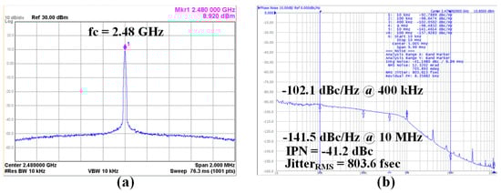 The ADPLL spectrum output at 2.48 GHz is shown in Figure 13a, and there is no noticeable spurious tone in the 2 MHz bandwidth. The phase noise of the ADPLL was measured at 2.48 GHz with a frequency multiplication ratio of 77.5, as shown in Figure 13b. This is the high-end center frequency of the BLE bands. The digital loop filter bandwidth is 750 kHz. The in-band phase noise measured at a 400 kHz offset is −102.1 dBc/Hz. The out-of-band phase noise at a 10 MHz offset is −141.5 dBc/Hz. The integrated phase noise from 100 k to 10 M is −41.2 dBc, and the root mean square (RMS) jitter is 803.6 fsec. The ADPLL can support from 2.21 to 2.58 GHz to cover whole BLE bands with margin.