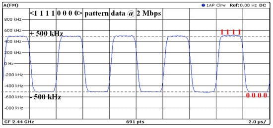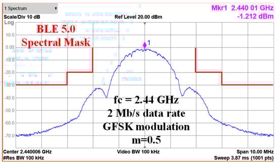 where fdev is the frequency deviation and Rb is the bit rate. The modulation index of the BLE typically ranges between 0.45 and 0.55. This range is selected to balance the trade-offs between bandwidth efficiency and error performance. Then, the fdev is between 450 and 550 kHz at a 2 Mb/s data rate, which is a 10% variation from the ideal modulated frequency. A modulation index of around 0.5 is ideal as it helps in achieving a good balance between the signal-to-noise ratio (SNR) and the bandwidth used. However, the BLE version 5.1 specification adds transmitter specifications for the angle of arrival (AoA) and angle of departure (AoD) to identify the orientation of a BLE module with improved accuracy []. This is defined by the stable modulation index (SMI), where the fdev is between 495 and 505 kHz at a 2 Mb/s data rate, with a 1% variation from the ideal modulation frequency.