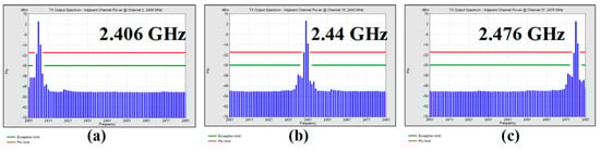 2 Mb/s GFSK spectrums at (a) 2.406 GHz, (b) 2.44 GHz, and (c) 2.476 GHz.