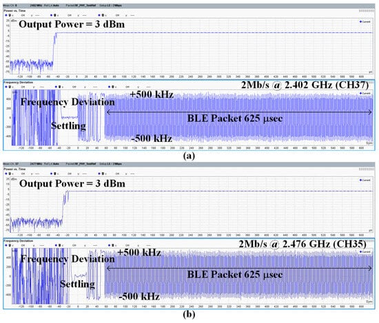 BLE output power and demodulated frequency for the BLE packet at (a) 2.402 GHz and (b) 2.477 GHz.