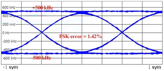 Figure 18 plots the eye diagram normalized at 500 kHz for 2 Mb/s GFSK modulation. The 1.42% FSK error was achieved due to the very high linearity of the TDC and DCO and the LMS-based DCO gain compensation for the TPM. Table 1 summarizes the performance of the proposed work and its comparison with the state-of-the-art PLL-based GFSK modulator [,,,,,,,]. The proposed GFSK modulator supports three advertising channels and 37 data channels from 2.4 to 2.48 GHz. Compared to the state of the art, the proposed modulator provides the maximum data rate of 2 Mb/s with TPM and the best in-band phase noise performance of −102.1 dBc/Hz. Moreover, the proposed modulator supports the best FSK error of 1.42% and full SMI specifications of BLE 5.0 standards by using PVT adaptiveness and linearity background calibrations for a TDC and a DCO.