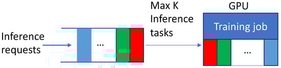Several approaches have been proposed to process multiple inference tasks on one GPU. Perseus [], for instance, executed ResNet50 and Inception-V3 together, achieving up to 12% cost reduction for model serving. Choi et al. [] designed a new scheduler that explores 3D search space of different batch sizes, temporal sharing, and spatial sharing between two inference tasks in one GPU. At the DL operator level, Yu et al. [] designed a search algorithm based on machine learning to run multiple inference tasks using the same input. Unlike [], we do not assume that inference models analyze the same input because it is unrealistic to assume that users provide the same input for mobile image sensing. KRISP [] spatially partitions a GPU at the kernel level to enhance GPU utilization. GSLICE [] collocates multiple inference jobs that share a DL model. COLTI [] attempts to extend GSLICE to support training in addition to serving inference requests using a common DL model; however, it is not clear how it avoids an OOM error or a large latency increase due to excessive co-location, unlike Corun. Moreover, Corun does not require concurrent inferences to use the same DL model, in contrast to GSLICE and COLTI. In [,], the concurrent running of inference tasks has been explored, enhancing the throughput of edge servers by 1.4× and 3.8×, respectively. However, continuous training for maintaining accuracy alongside concurrent inferences is not considered in these works.
