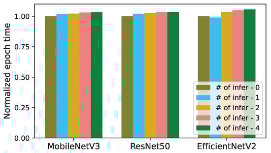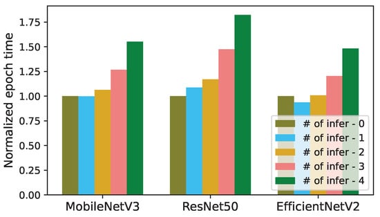 Figure 4 illustrates that the epoch lengths of MobileNetV3, ResNet50, and EfficientNetV2 increase by up to 1.035×, 1.033×, and 1.056×, respectively, when each training job is run with 4 concurrent Transformer inferences for dehazing. When K increases from 1 to 4, the actual epoch times of MobileNetV3, ResNet50, and EfficientNetV2 increase from 218.85 to 226.69 s, 242.02 to 250.1 s, and 1967.71 to 2078.23 s, respectively. Thus, the impact of concurrent Transformer inferences on the training epoch time is insignificant. This is potentially because the Transformer experiments are undertaken in the NVIDIA Geforce RTX 4090 GPU, which has additional memory and other resources compared to the NVIDIA Geforce RTX 3080 GPU used for the CNN experiments.