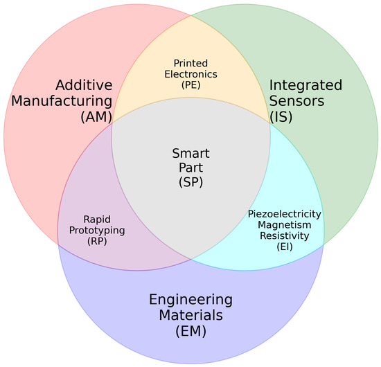 A specific example of SP application is the manufacturing of smart spare parts, essential in critical sectors such as energy [], manufacturing [] and aerospace [,]. These components have the capability to indicate the optimal time for their replacement, as well as predict and prevent catastrophic failures through continuous monitoring, which could represent a significant advancement. Although conventional manufacturing methods still dominate the market, additive manufacturing is well positioned to address specific niches, leveraging advantages such as customization and cost reduction.